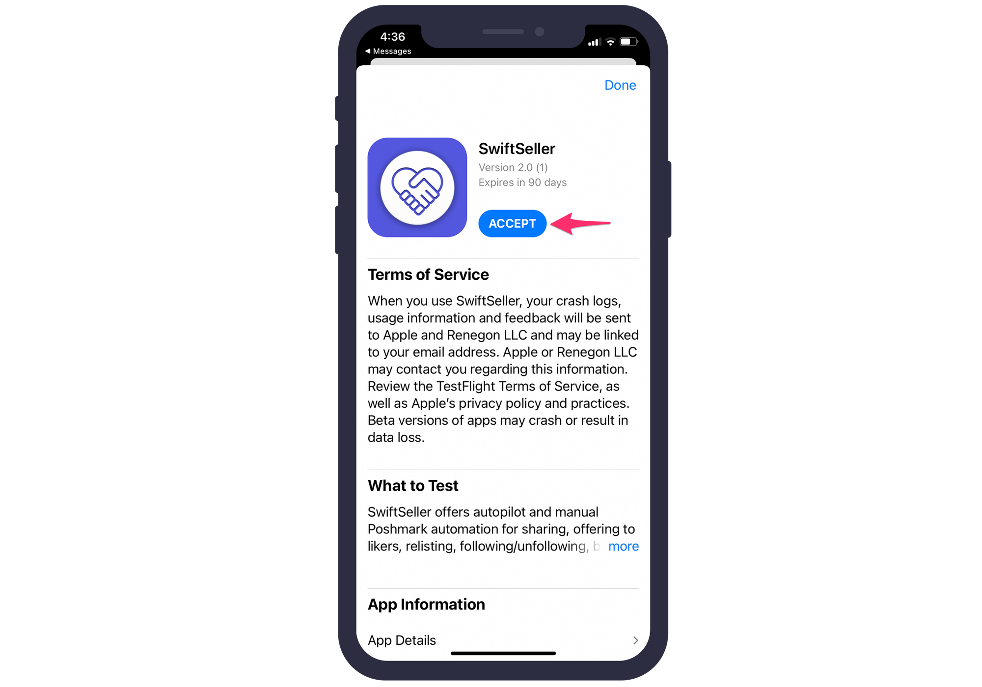 Now that TestFlight has been installed, tap the link here to install the SwiftSeller beta.After you tap the link should be presented with a screen below. Tap Accept and then Install. SwiftSeller should then begin installing. The Install button should turn into an Open button. Tap Open or go to your home screen and find SwiftSeller.