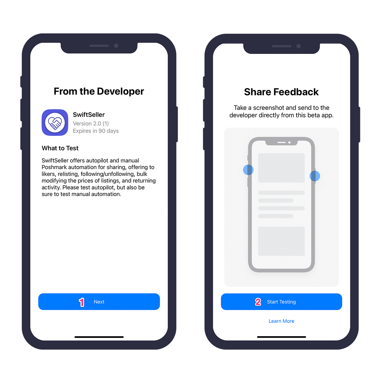 When you first open SwiftSeller, you'll find notes from us that look like the screens below. Tap Next in the first screen and Start Testing in the second screen.