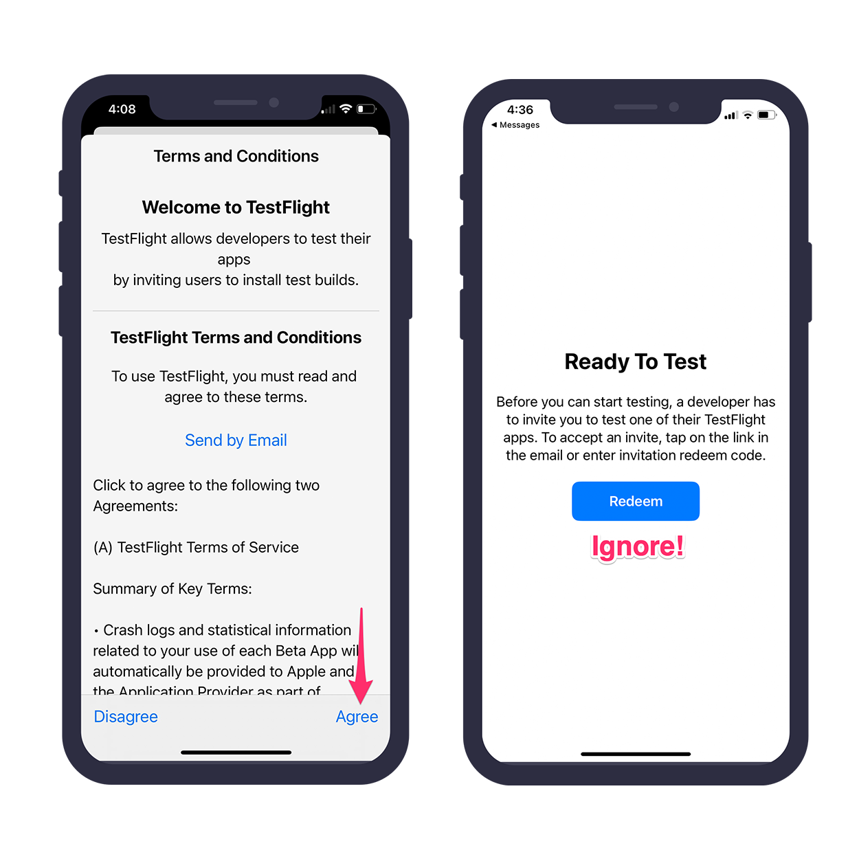 Head to the App Store and install the TestFlight app by clicking the link here.After you have installed TestFlight open the app. You should be presented with a Terms and Conditions screen. Tap Agree in the bottom right corner of the screen. After you agree to the terms, you should be presented with a screen asking you to redeem a code. Please ignore this - DO NOT put the invite code you received in the email here.